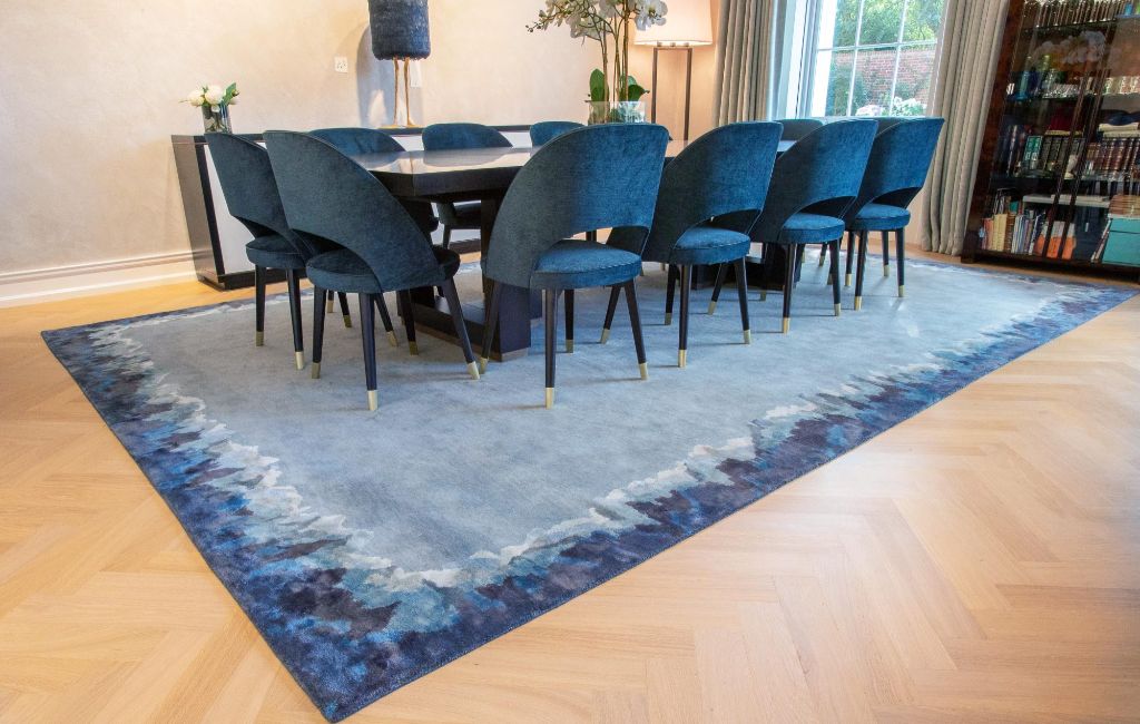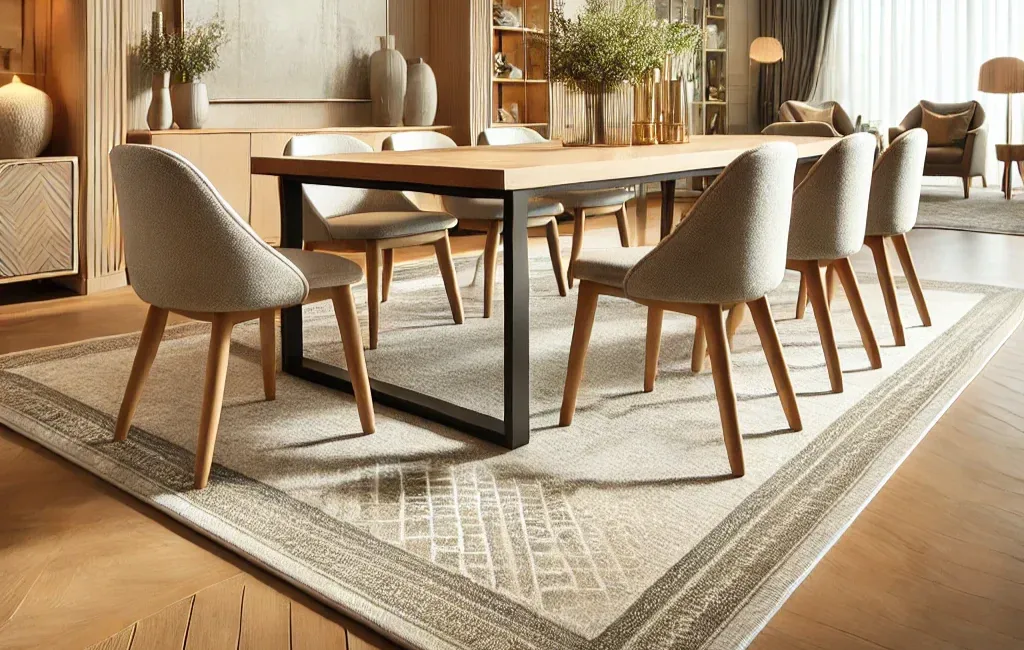 Custom-sized dining area carpets are available in various styles and colors at our store, including washable options for easy care. We offer rectangular and round carpets that fit well under your dining table.