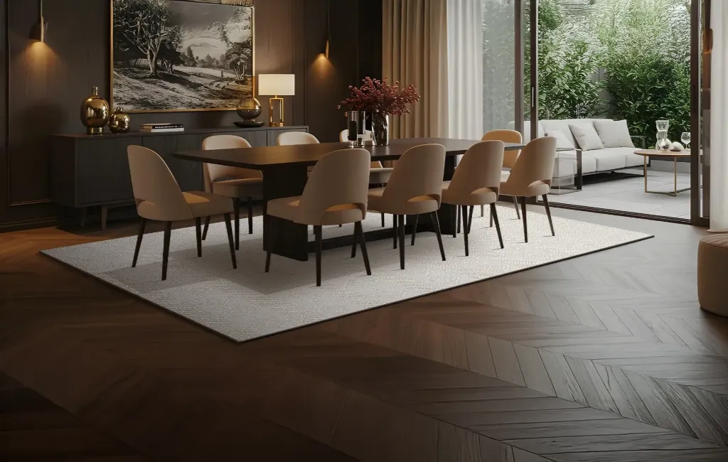 We provide wool for insulation and sisal for durability. Our jute carpets help allergy-sensitive users, while olefin works well in moisture-prone areas. We also supply nylon for stain resistance and affordability, and polyester as a soft yet wear-resistant material. All our bespoke dining room under-table carpets let customers create floors that perfectly match their interior preferences.