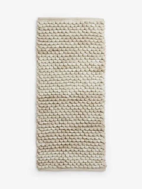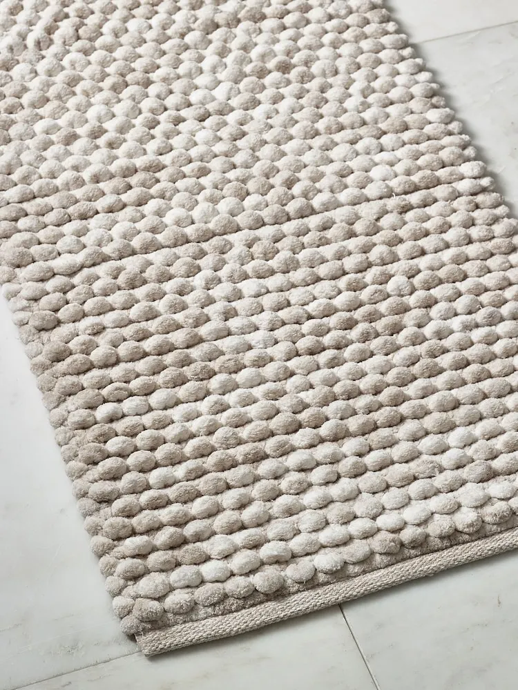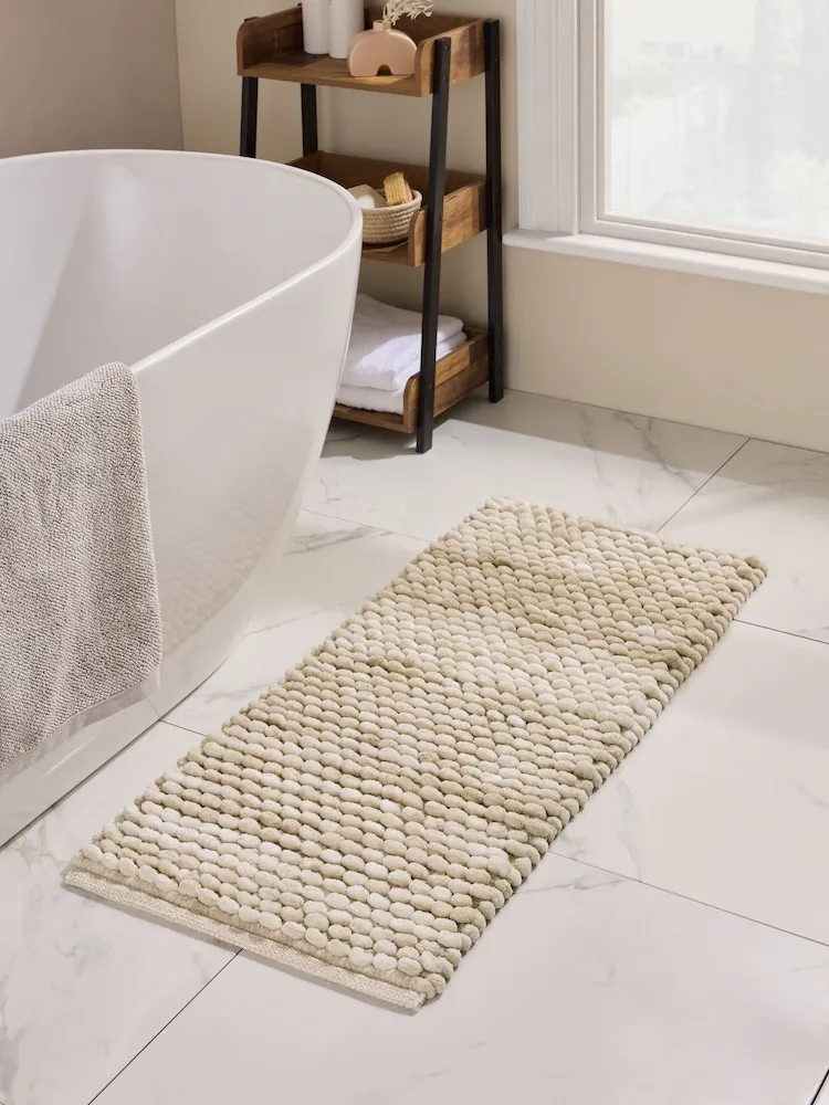 This giant bobble mat is crafted with a premium blend of 82% recycled polyester and 18% cotton, providing a luxuriously thick and soft feel underfoot. Measuring 110cm by 45cm, its unique oversized texture is designed to be highly absorbent while adding a sophisticated, tactile element to your modern bathroom decor. This high-quality construction allows the mat to soak up moisture effectively, keeping your floors dry and providing a plush, spa-like experience every time you step out of the bath.
