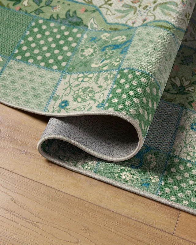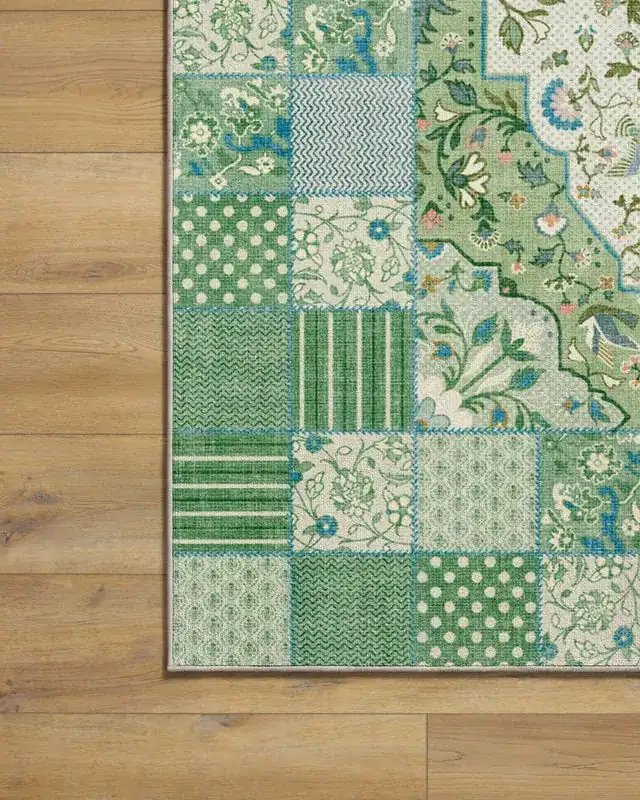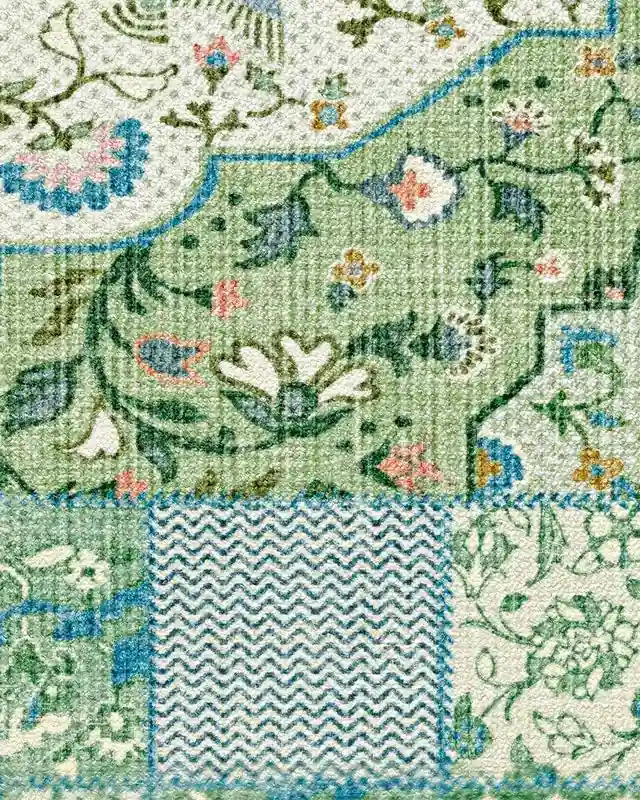 Experience patchwork perfection with the Playful Patchwork Green Rug, a beautiful blend of sage green and cream accented by delicate pops of blue and pink. This design features vintage-inspired medallions and floral patterns woven into a mixed-scale geometric border, creating a look that is both timeless and full of personality. Built for the modern home, the low-profile synthetic construction is water-resistant, stain-resistant, and fully machine-washable for effortless maintenance.