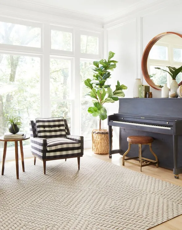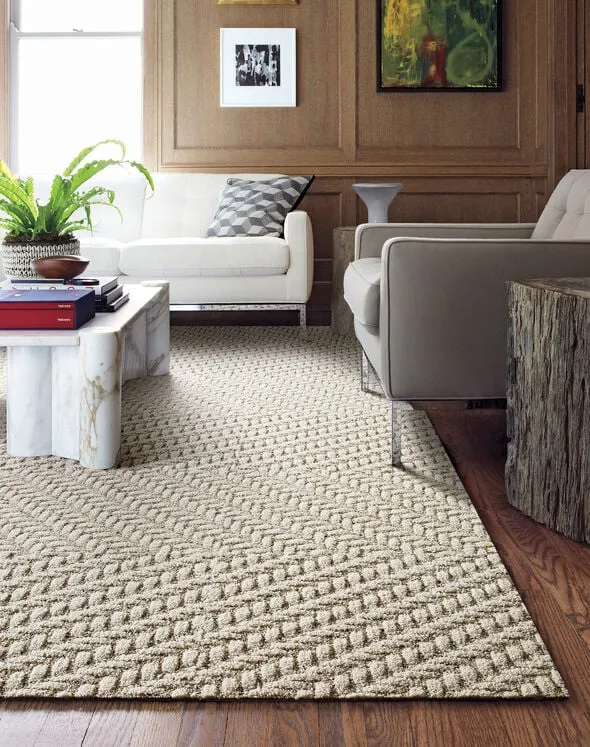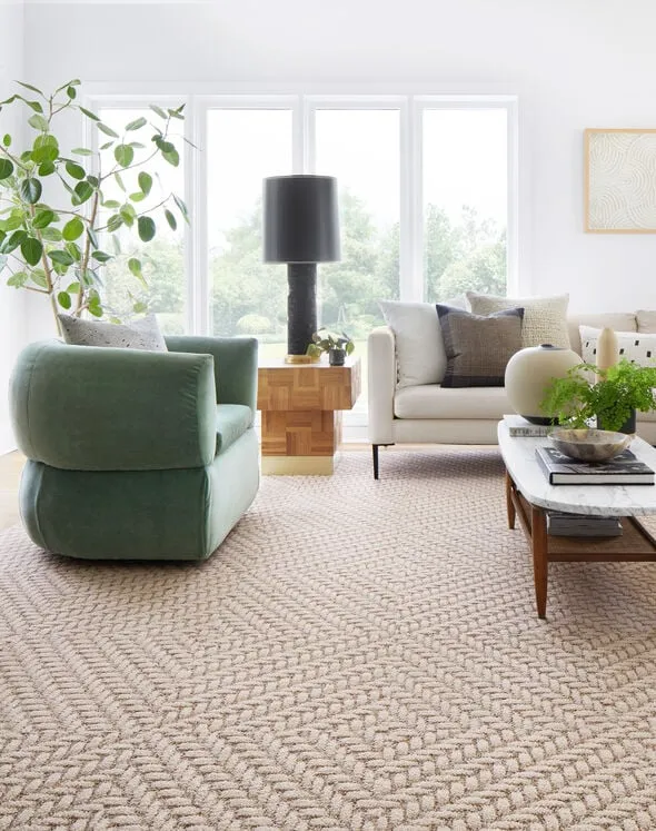 This woven jute-inspired carpet tile offers a soft, welcoming feel while delivering the durability needed for heavy foot traffic. Its natural texture adds warmth and character to any space. For added visual interest, tiles can be rotated to create striking chevron or diamond patterns. With a random, non-aligning design, every installation results in a truly unique look.